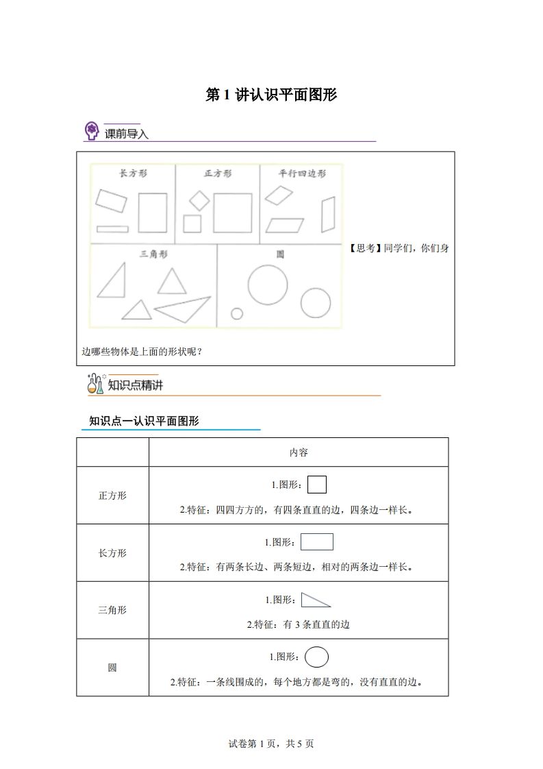 人教版数学一年级下册1-1认识平面图形练习卷(基础卷)