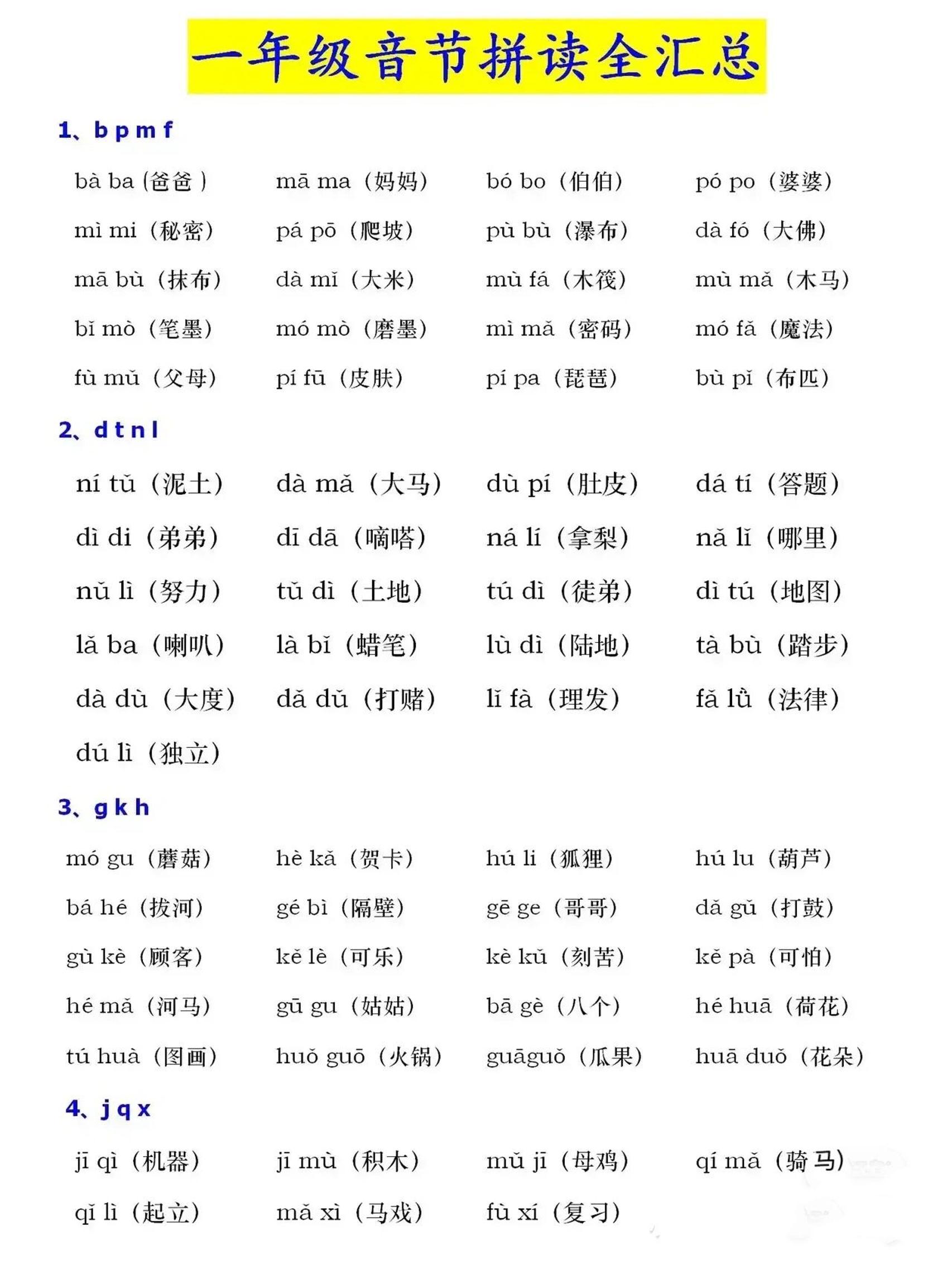 一年级上语文音节拼读全汇总