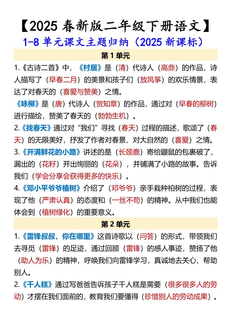 2025春新版【二年级下册语文】1-8单元课文主题归纳