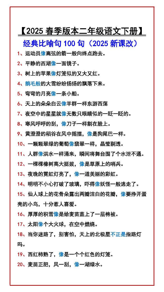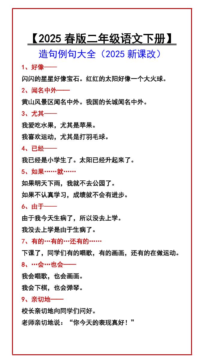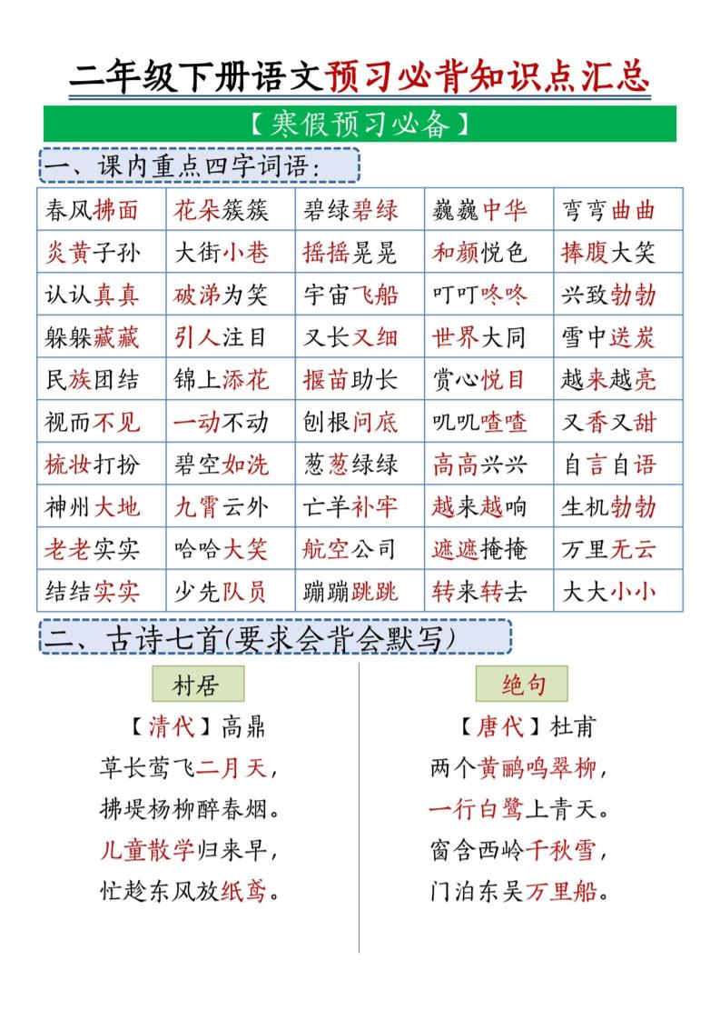 二年级语文下册期末复习课内重点早读晚默拔尖小卡片15页