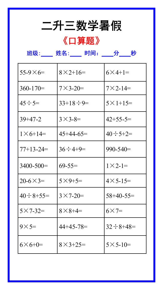 二升三年级数学暑假《口算练习题》汇总-三上数学
