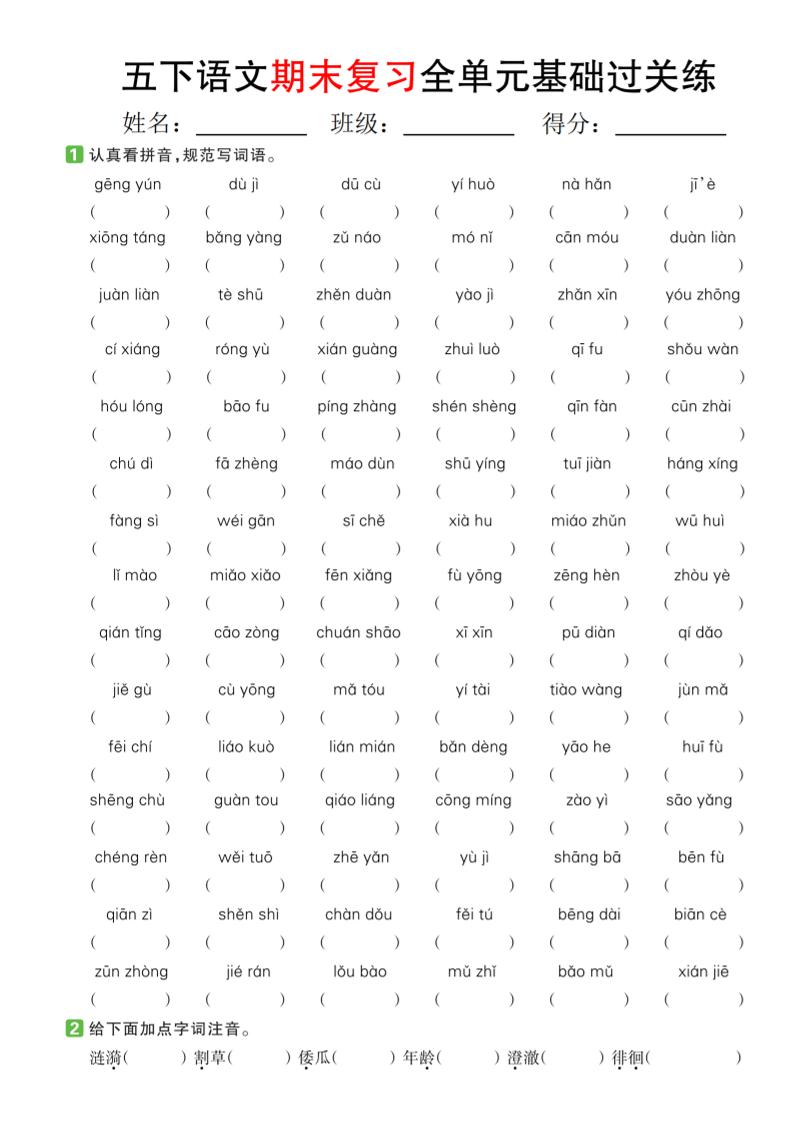 【期末复习系列】五下语文期末复习全单元基础过关练