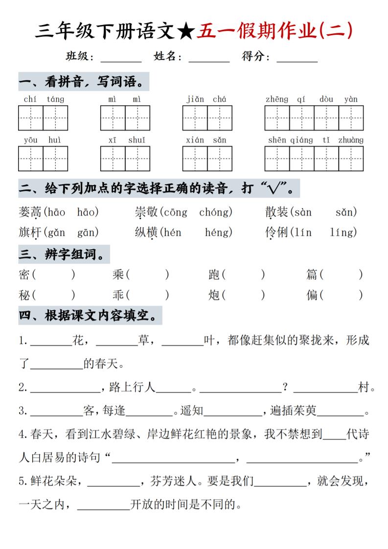 初级 三下语文五一假期作业