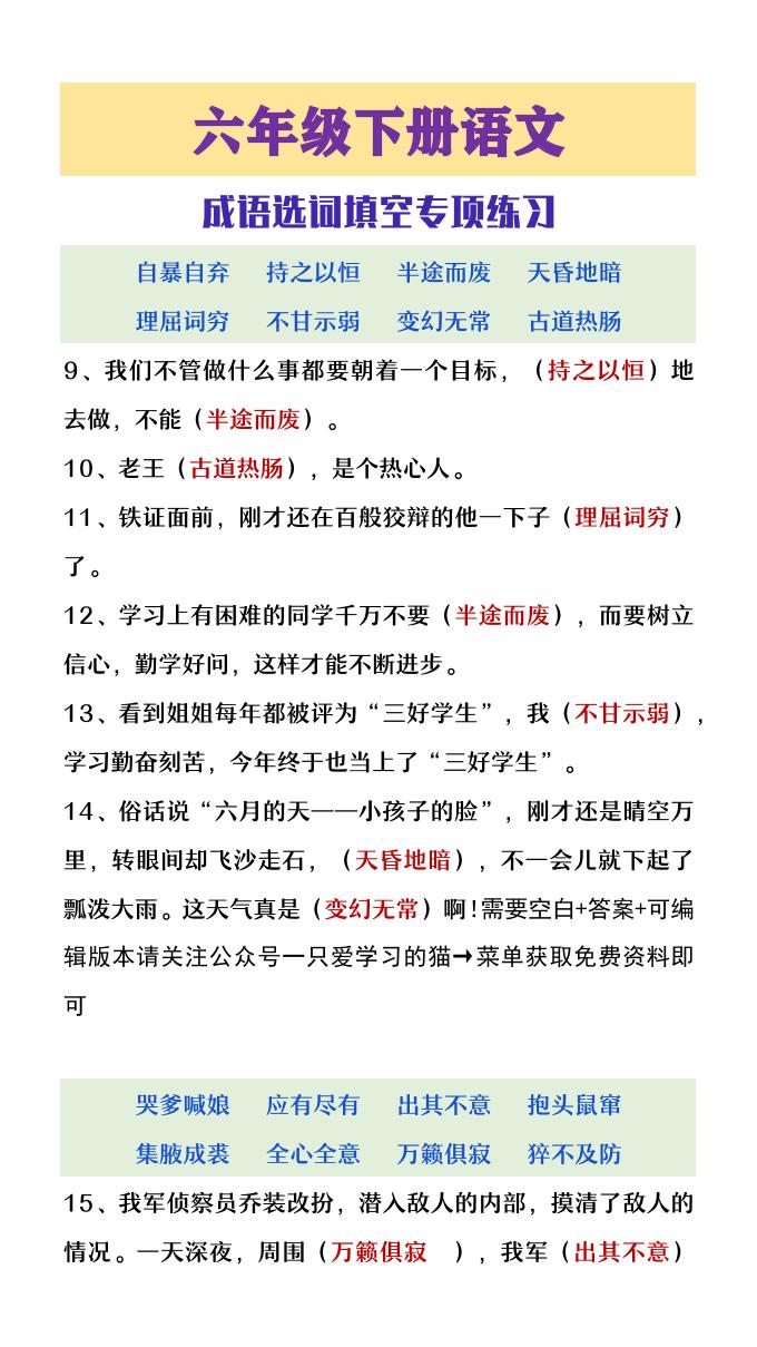 首页 > 全部 > 语文 > 2025春新版六年级下册语文成语选词填空练习
