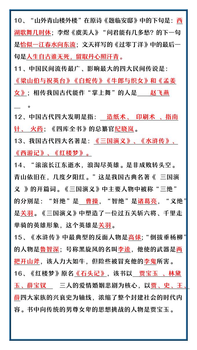 初级 2025春新版六年级语文必考文学知识汇总