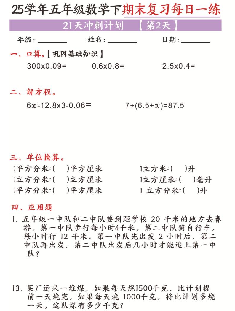 首页 > 全部 > 数学 > 25五下数学期末复习每日一练21天冲刺计划