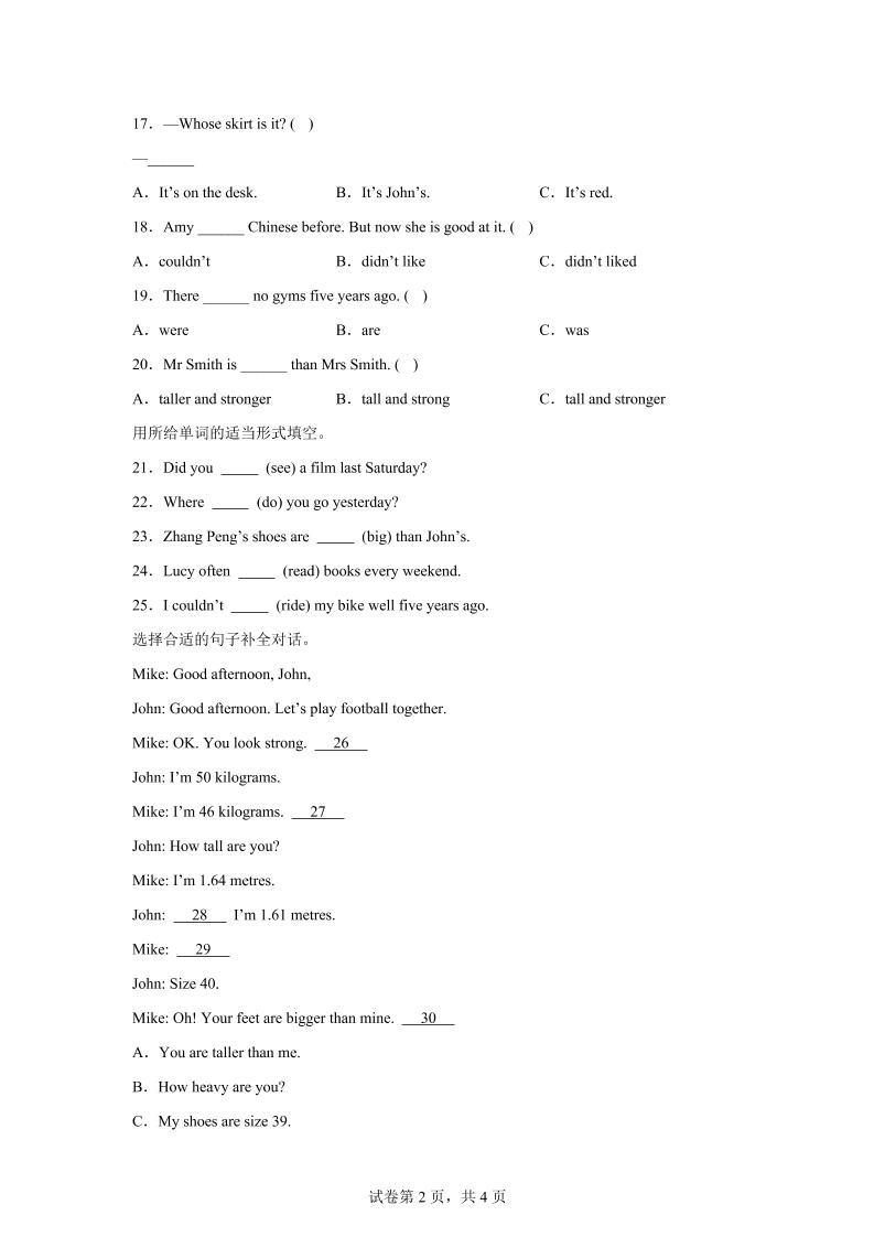 初级 人教PEP版六年级下册期末能力检测英语试卷
