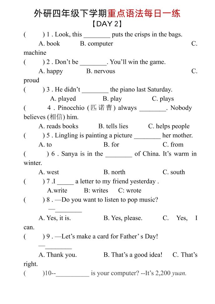 四年级下英语重点语法每日一练《外研版》