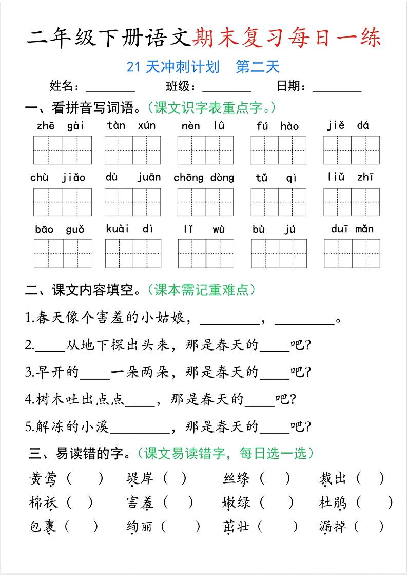 二下语文期末复习21天冲刺计划每日一练(1)