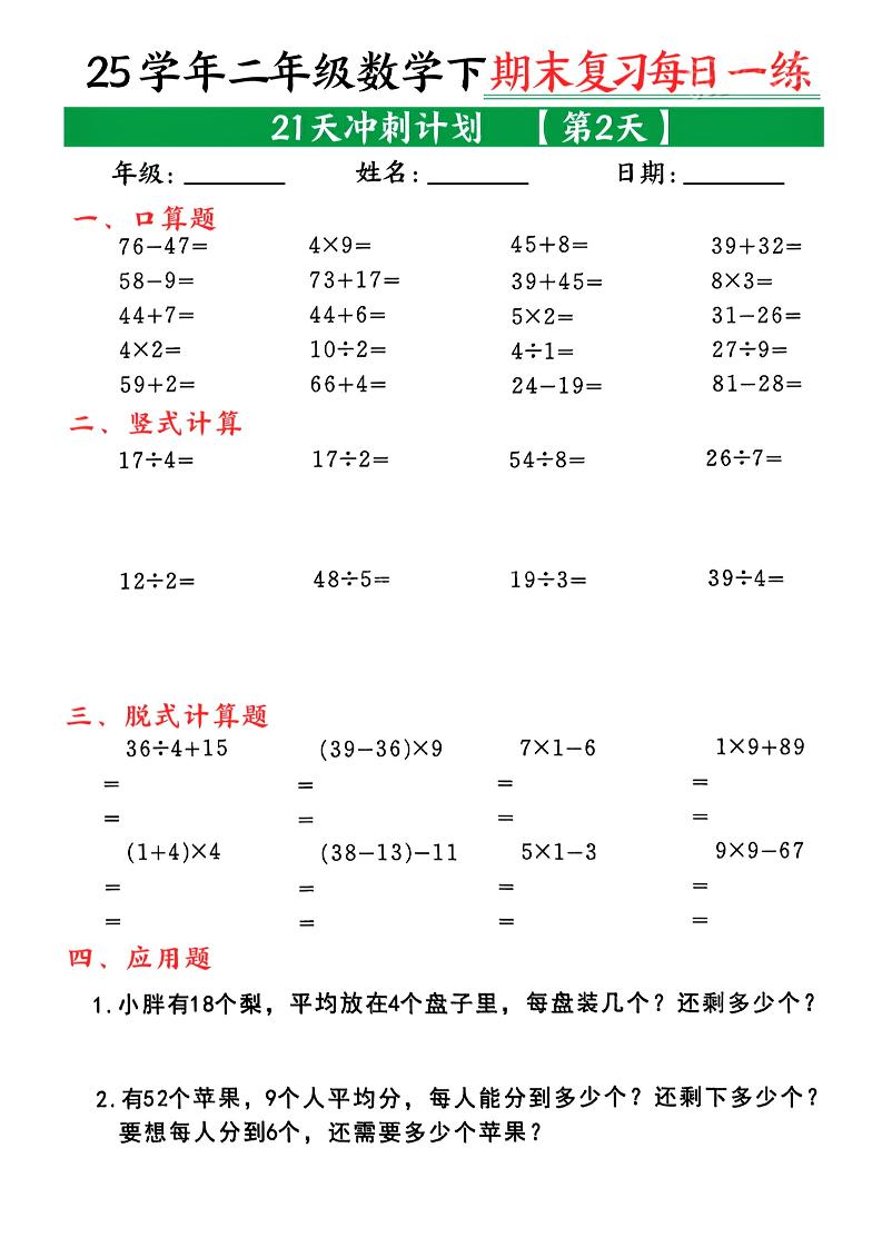 初级 二下数学期末复习21天冲刺计划