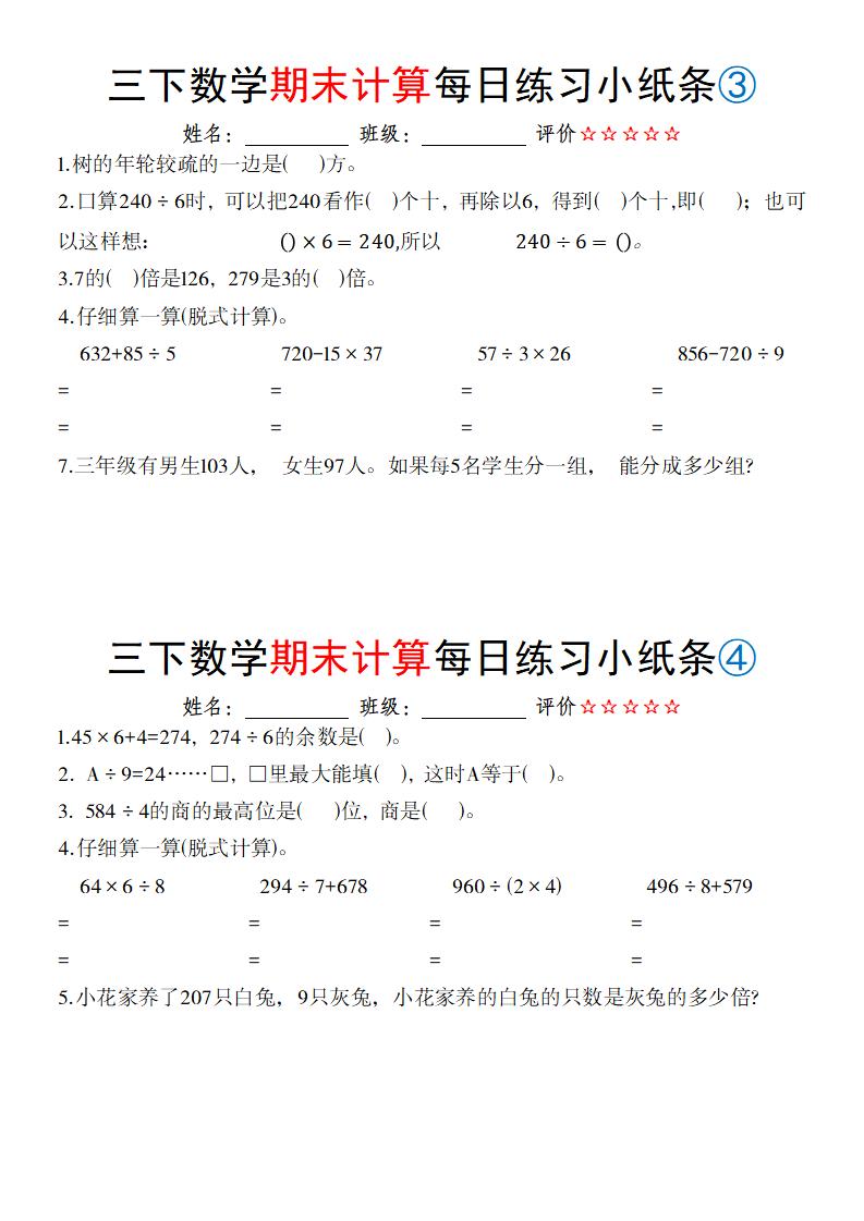 初级 【数学】【通用】三下数学期末计算每日练习小纸条(无答案)