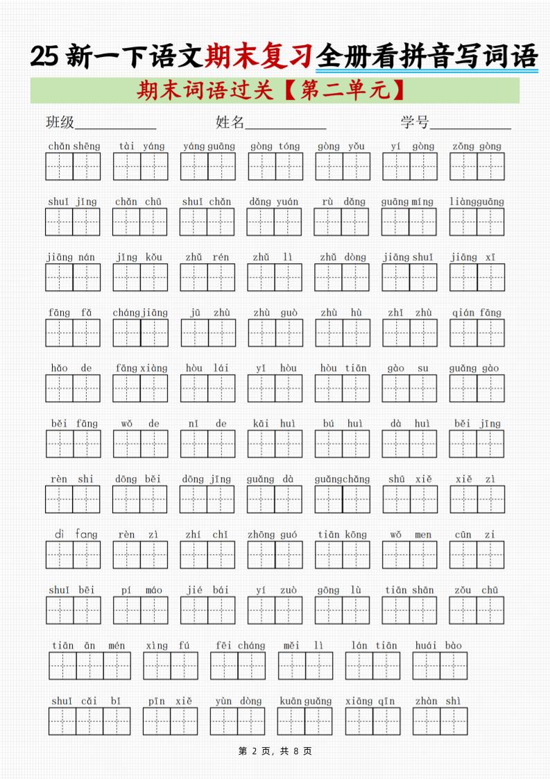 初级 25新一下语文期末复习全册1-8单元看拼音写词语(8页)