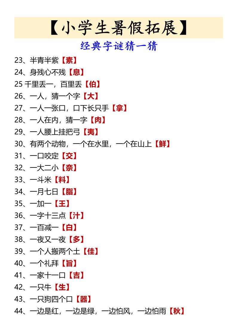 初级 【小学生暑假拓展】经典字谜猜一猜-小升初语文