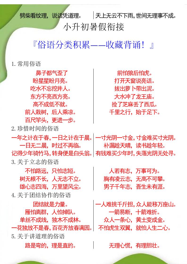 初级 小升初暑假衔接之俗语分类积累-小升初语文