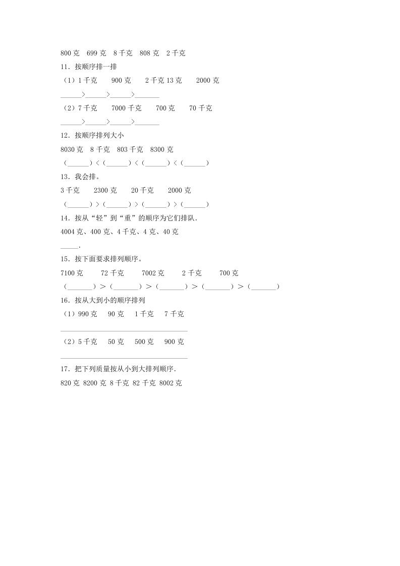 初级 【题型专项特训】三年级数学上册第二单元千克和克专项训练——排序题(苏教版,含答案)