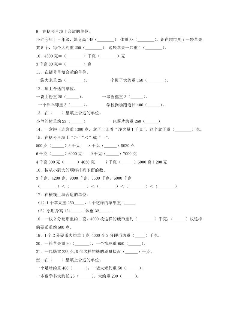 初级 【题型专项特训】三年级数学上册第二单元千克和克专项训练——填空题(苏教版,含答案)