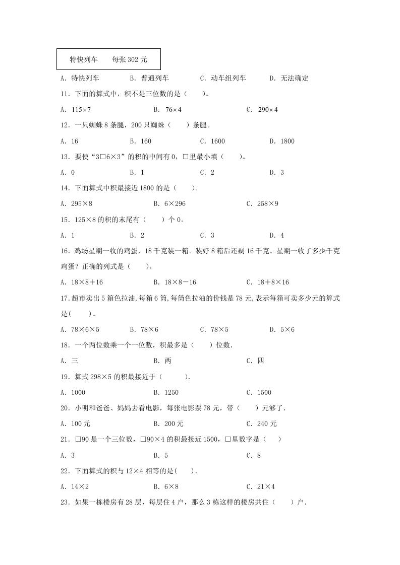 初级 【题型专项特训】三年级数学上册第一单元两、三位数乘以一位数专项训练——选择题(苏教版,含答案)