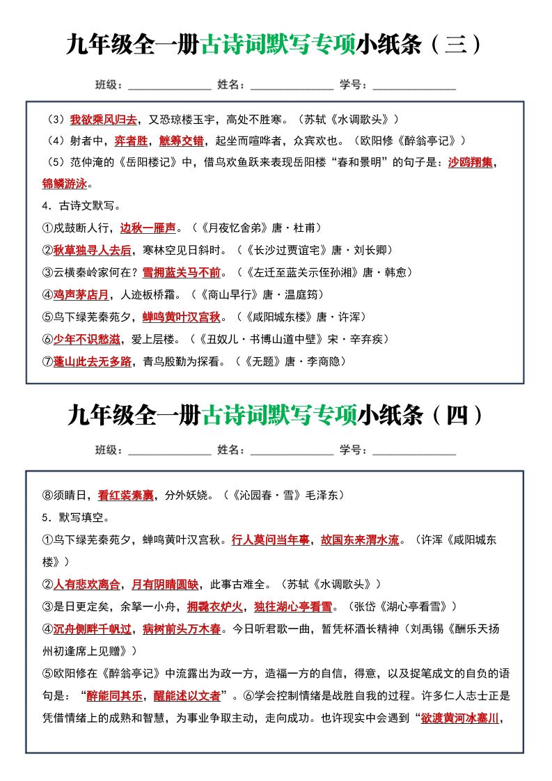 初级 九年级全一册古诗文天天默写小纸条【答案】