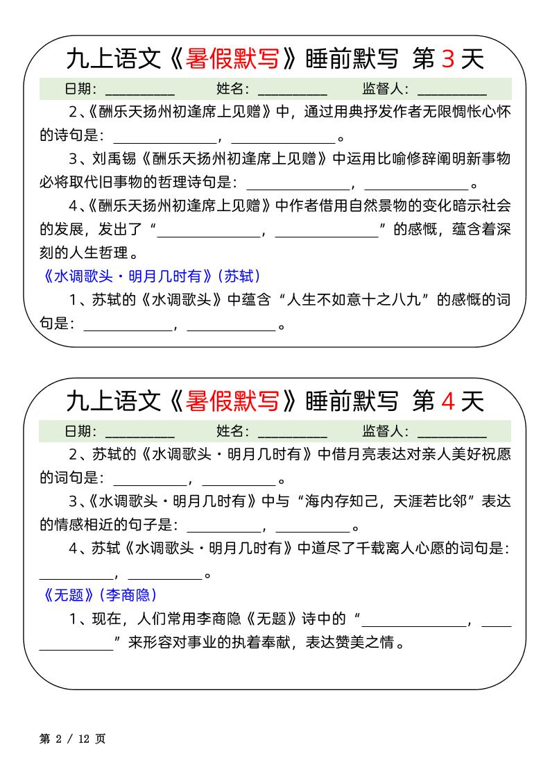 初级 九上语文《暑假预习》睡前默写12天