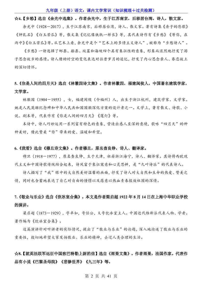 初级 九上语文课内文学常识(知识梳理+过关检测)
