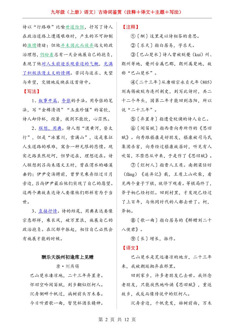 九上语文全册【古诗词鉴赏】(注释+译文+主题+写法)