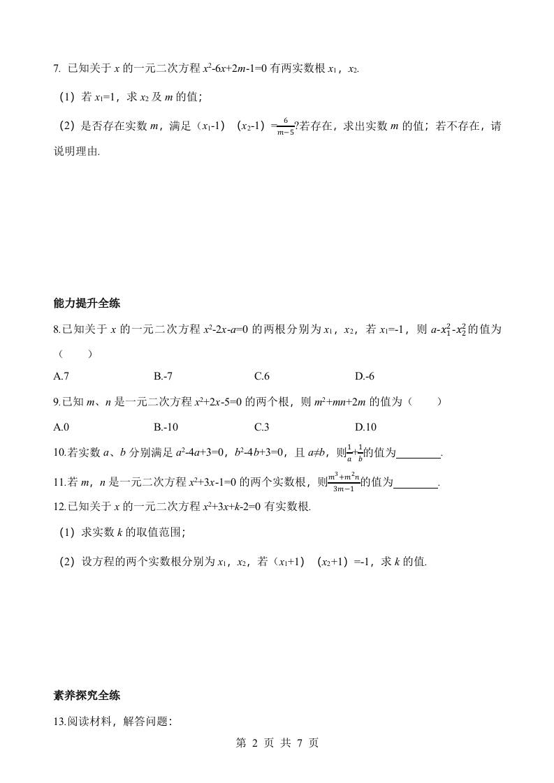 初级 4.6 一元二次方程根与系数的关系 同步练习