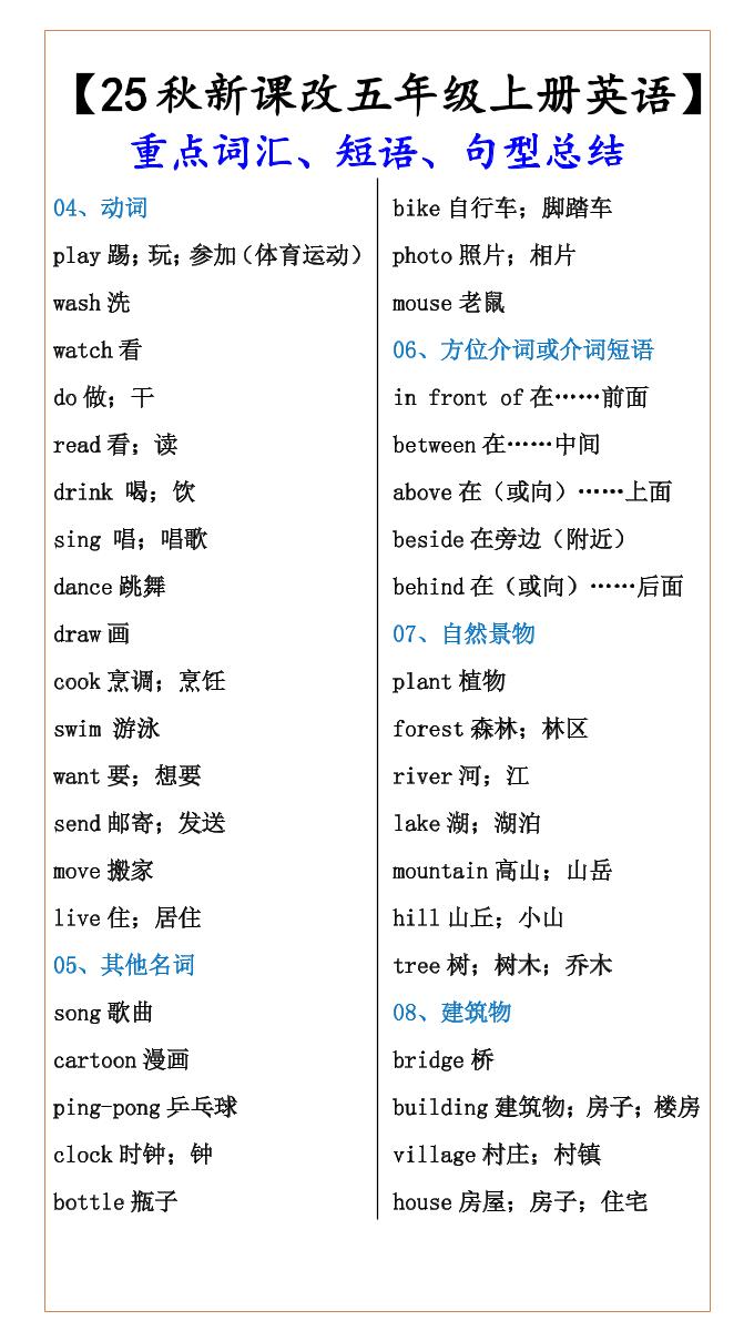 初级 【2025秋新版】【五年级上册英语】重点词汇、短语、句型总结