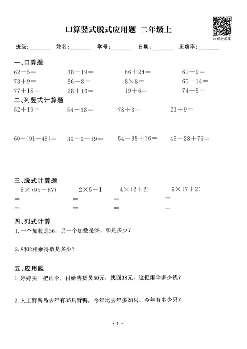 初级 二年级上 数学口算竖式脱式应用题每日一练