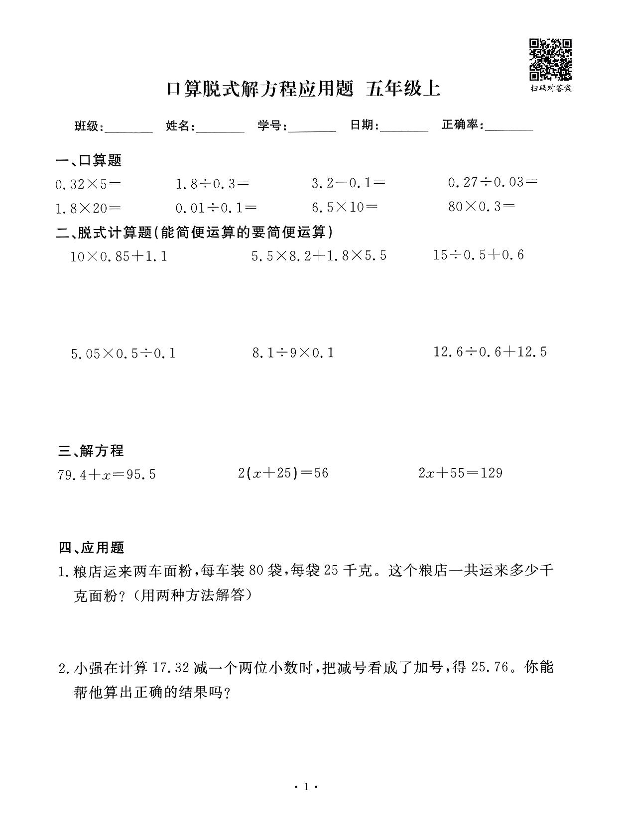 初级 五年级上 数学口算竖式脱式应用题每日一练