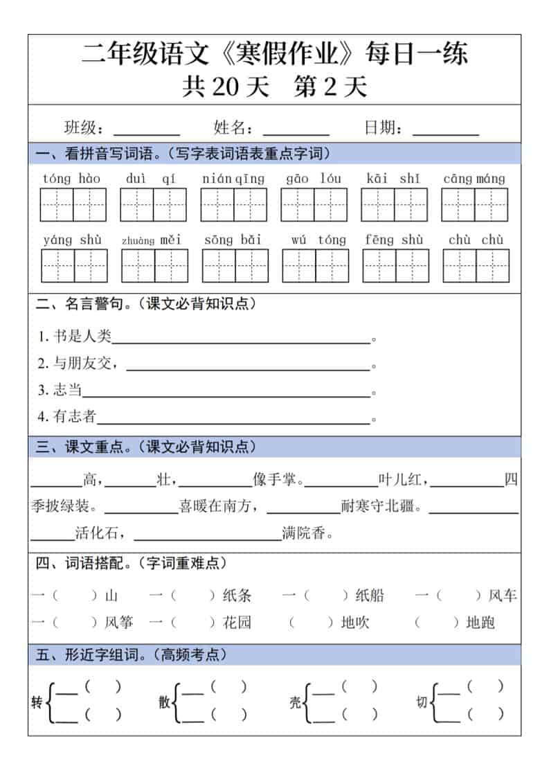 二年级上语文寒假作业每日一练